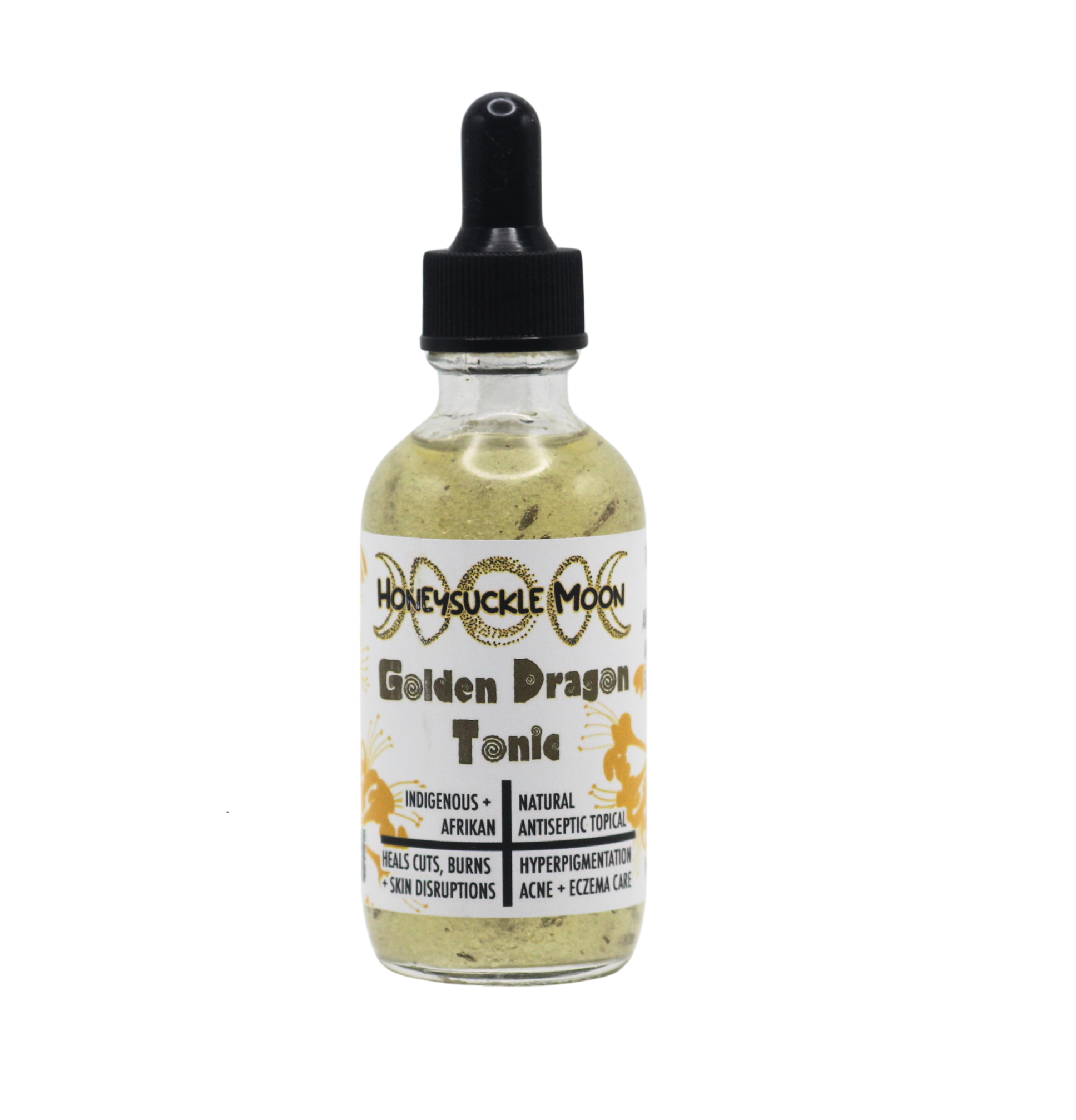 Golden Dragon Tonic – Experience the healing benefits of Honeysuckle Moon’s Golden Dragon Tonic, a powerful Cellular Regenerative Antiseptic Topical Serum designed to combat a range of skin concerns, including acne, eczema, hyperpigmentation, folliculitis, insect bites, cuts, burns, blisters, and boils. This potent formula cleanses the affected areas, promoting rapid healing and restoring your skin’s natural balance. Handcrafted from a treasured wellness recipe passed down by our Indigenous African Ancestors, this herbal infusion is a must-have in your skin care arsenal. Key ingredients like Aloe Vera, Goldenseal, Tea Tree, and a proprietary Herbal Complex work synergistically to deliver unparalleled results. Discover why we never leave home without Golden Dragon Tonic—your ultimate solution for resilient, healthy skin.