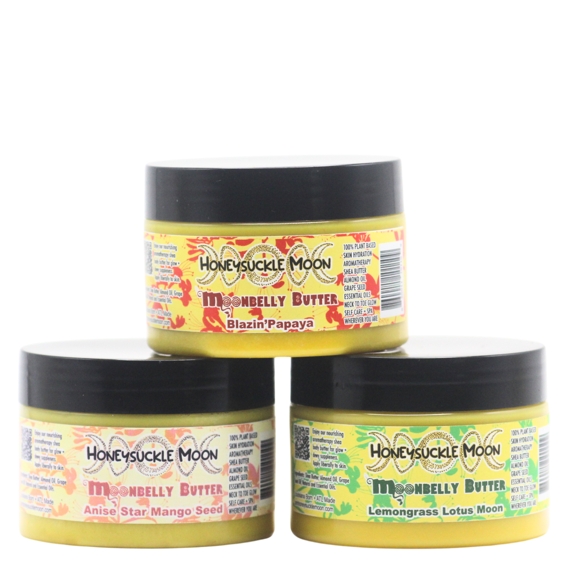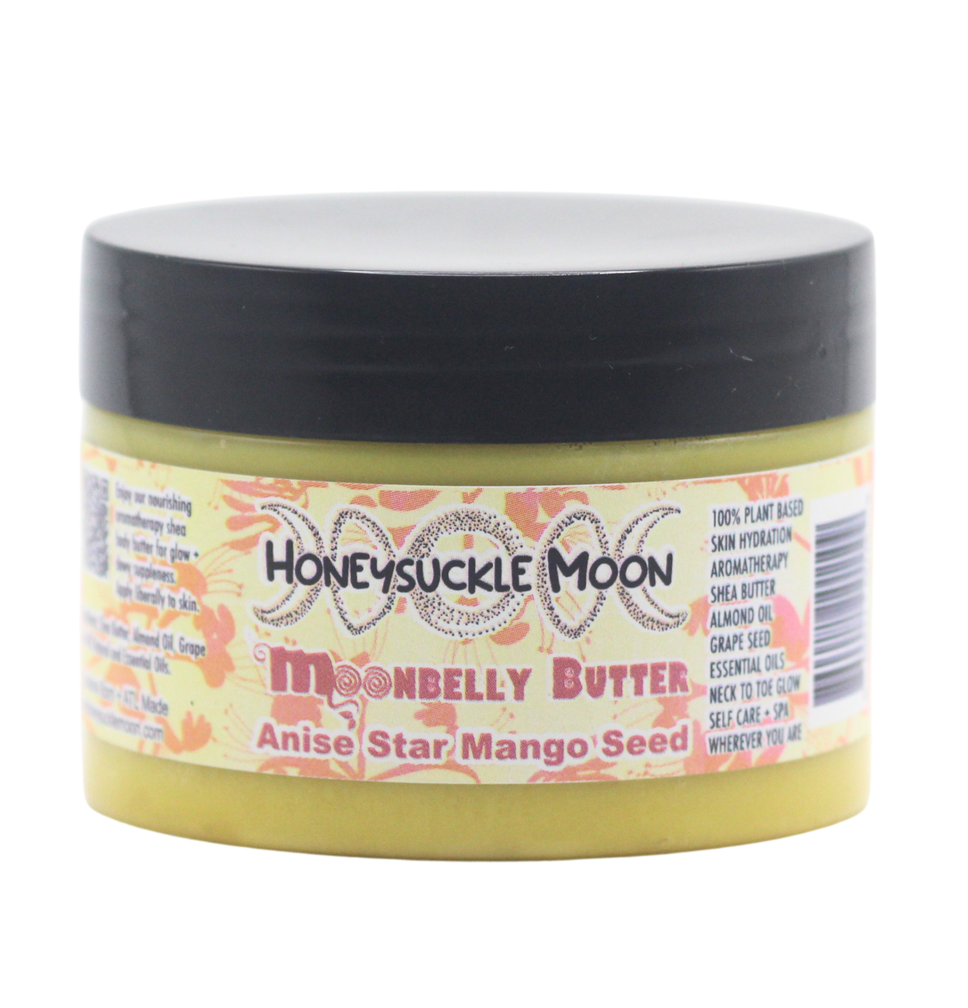 Enjoy Honeysuckle Moon’s MoonBelly Butters – the original shea and almond-based aromatherapy body butter recipes that set the global standard for smooth, luxurious hydration. Our rich, nourishing blends deeply moisturize and protect all skin types from neck to toe, leaving your skin soft, supple, and radiant. Each MoonBelly Butter is a customizable recipe, allowing you to select from our incredible aromatherapeutic infusions to create a personalized skincare experience.