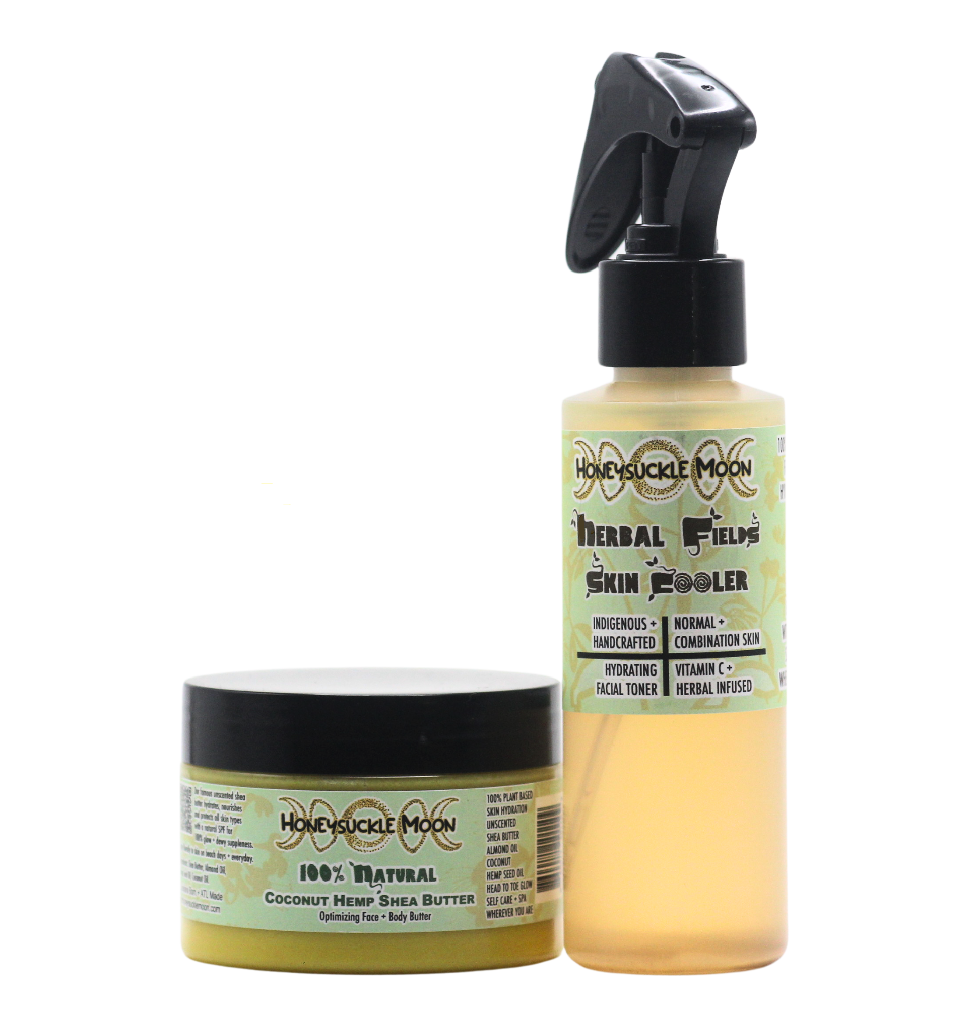 Enjoy the Honeysuckle Moon Everyday Plant Based Face Organic Hydration + Toning Set. Organically speaking, this set can be used with all of our handcrafted facial products, as well as, other skin care regimens. Especially, the natural ones… It provides the all day skin hydration and pH balance skin-friendly herbotanicals that include shea, coconut, aloe vera, burdock root, almond, Egyptian marigold, elder flower, vitamin C and more! This set includes: